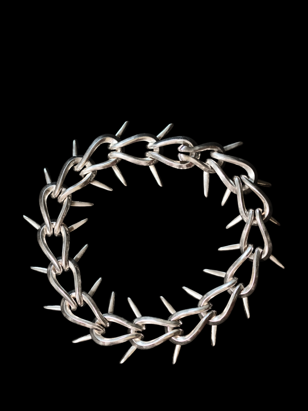 A true statement piece. An heavy, open looped chain formed through hand carved links. This chain has two sides - a smooth braided look, lifted over the skin by its spines, and a barbed look, with the spines facing outward.